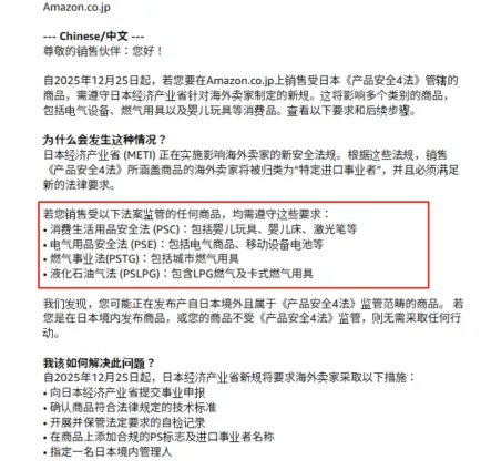 亚马逊日本站卖家请注意!日本经济产业省(METI)修订后的四项商品安全法将于2025年12月25日正式生效。