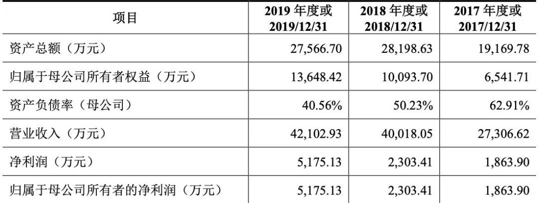2017年度、2018年度和2019年度,公司营业收入分别为27,306.62万元、 40,018.05万元和42,102.93万元,扣除非经常性损益后归属于公司普通股股东的净利润分别为1,822.68万元、2,127.01万元和 5,078.43万元。