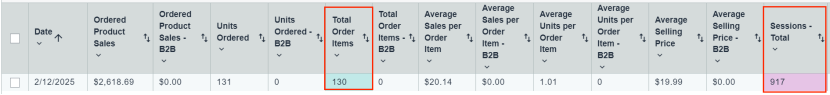 比如某一天2025年2月12日,我的产品有917个Sessions(也就是917个用户),130个订单。这里的Session转化率约是14%。
