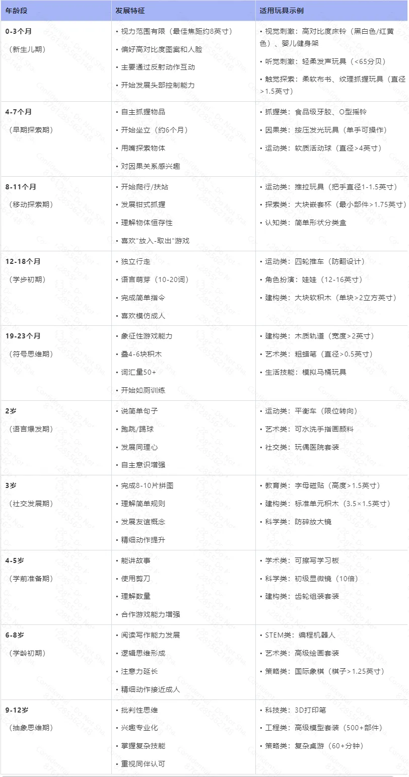 CPSC的年龄分级体系是基于儿童发展心理学和行为学研究建立的,主要参考了皮亚杰(Jean Piaget)等发展心理学家的理论。该体系将儿童分为10个年龄组,每个组别对应不同的身体、认知、情感和社会发展特征,并据此规定了适用的玩具类型和安全标准。以下是各年龄组的详细分析: