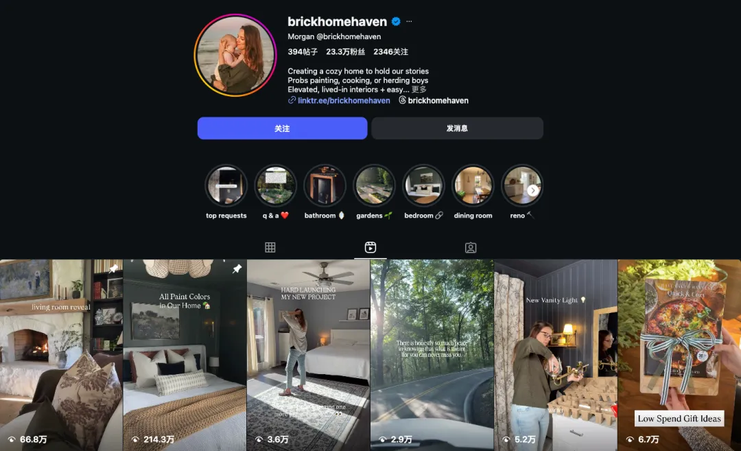 以品牌和@brickhomehaven的合作为例,这是一个分享家庭生活的账号,主要成员就是Morgan一家五口,是非常典型的高知白人家庭。在其拥有的23.5万粉丝中,中产白人群体占据了绝大多数,非常符合BREEO的用户画像。