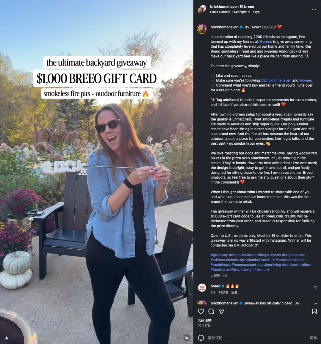 最终,这条合作视频收获了7.5万次播放、735次点赞和2000多条评论,超高互动率的背后是GIVE AWAY活动在做支撑。配合上Morgan本人在贴文简介处写下的超级真实的使用感受,本次合作为BREEO带来的转化绝对超出品牌预期,是一次相当成功的推广。