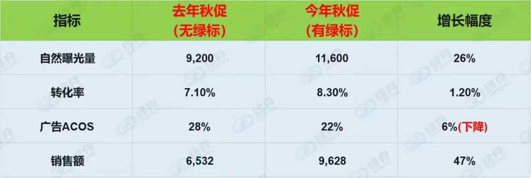 一位户外类目的中小卖家表示:“无论是与去年秋促还是今年会员日相比,做了绿标之后,我们的流量和销量都有明显提升。更惊喜的是,ACOS也降下来了,广告整体成本降了大概40%。”在亚马逊广告成本持续走高、转化效率却未见明显改善的背景下,该卖家于今年8月布局绿标,赶在秋促前完成上标,成效显著:
