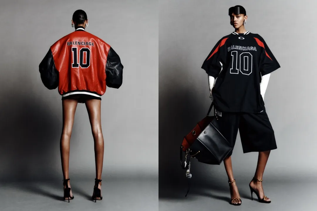 这一系列涵盖服装、鞋履、配饰及小型皮具,整体以无性别设计呈现。电光蓝、猩红与白色贯穿其中,呼应 NBA 经典配色,也与 Balenciaga 标志性的量感廓形呼应。长短袖 T 恤、运动套装、棒球衫与教练夹克采用皮革、尼龙缎布、再生棉府绸及日本丹宁等材质打造,强调身体在运动与行走中的存在感。所有单品皆饰以数字「10」,即「le dix」,象征品牌诞生地巴黎乔治五世大道 10 号,将体育符号和经典高级时装屋的历史相联结。