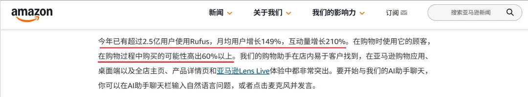 亚马逊官方数据统计,去年已有超过2.5亿用户使用亚马逊的AI购物助手Rufus,其月均用户增长高达149%,互动量增长超过210%。更重要的是,数据显示,在购物过程中使用Rufus的顾客,购买可能性提升了60%以上。