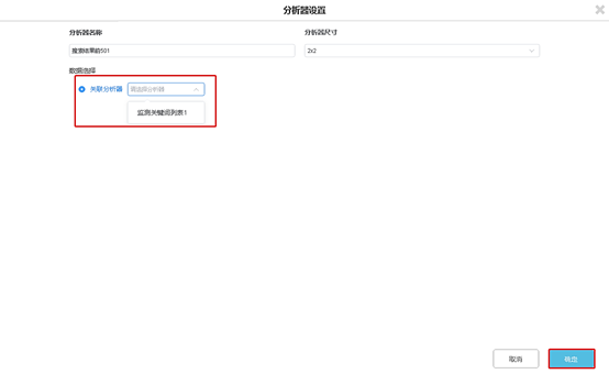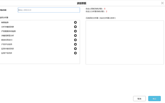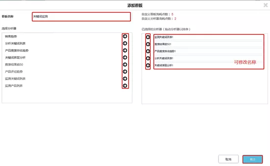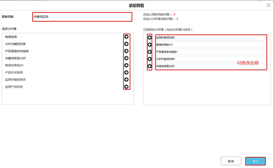 2.填写看板名称,点击分析器名称或向右箭头选择需要的分析器,可重复选择(注意最多不能超过12个分析器);在右边的已选择的分析器中,点击向左箭头移除分析器,点击分析器名称可修改名称(不能与系统中存在的分析器名称重复),可以拖动分析器排序。填写完成后,点击确定。