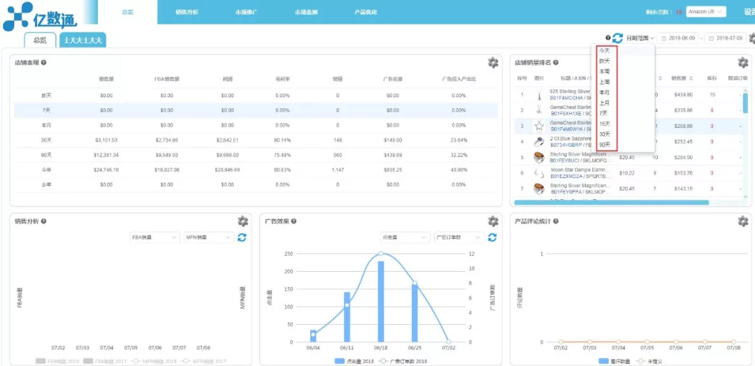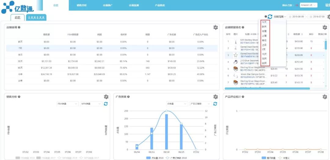 每个功能模块页面都有一个默认看板,在此页面上可以对看板进行设置,也可以选择看板时间范围。下面以总览页面为例。