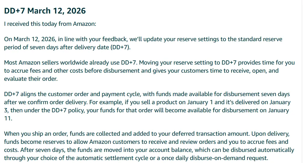 亚马逊已宣布自2026年3月12日起全面实施“DD+7”资金预留政策,即订单妥投后资金再预留7天。所谓DD+7,是指在确认送达后7天才会释放货款。