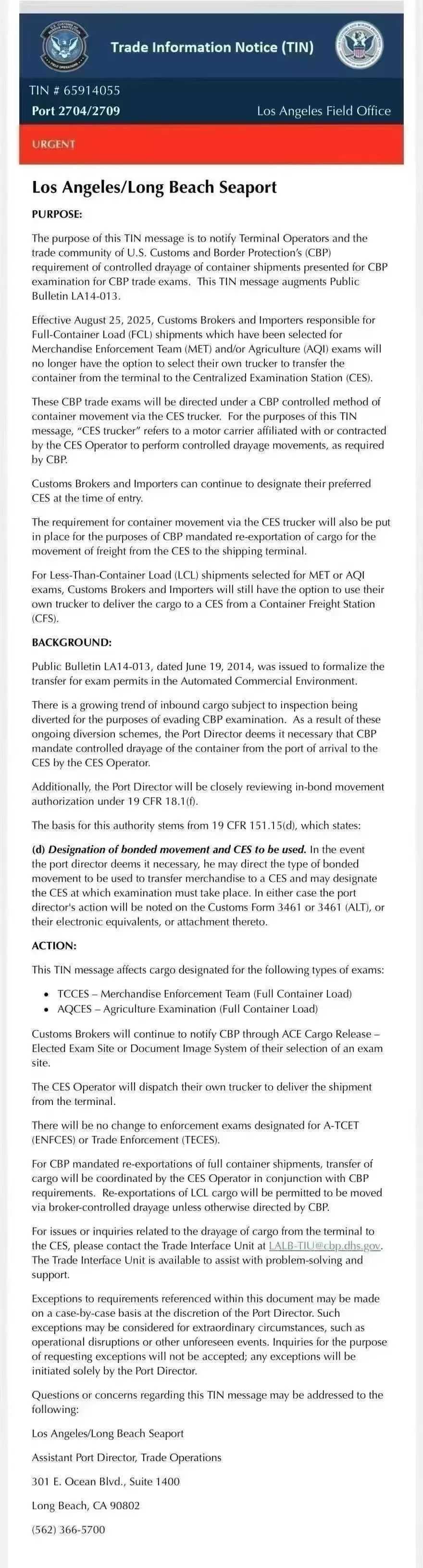 美国海关与边境保护局(CBP)现要求对洛杉矶/长滩港需接受查验的集装箱货物实施受控短驳运输。