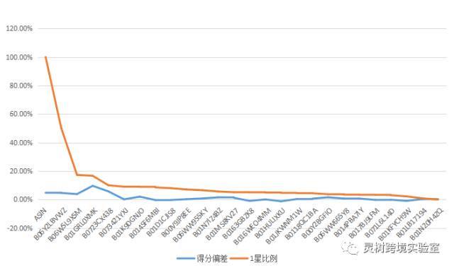 需要说明的是,亚马逊上显示的得分是经过四舍五入的,而excel计算出来的是精确的,所以偏差这一列凡是在正负1个点以内的,可以认为跟亚马逊上的得分一致。所以从表里面不难看出,大部分ASIN的亚马逊得分与平均分是一致的,但是有几个ASIN(标黄的)偏差比较大,并且平均分都是偏高。我们也可以看到,得分偏差较大的几个ASIN同时1星VP评论占比也是最高的,这两者之间具有明显的相关性,下面这个图看起来会更清晰一点