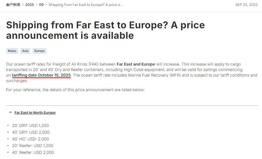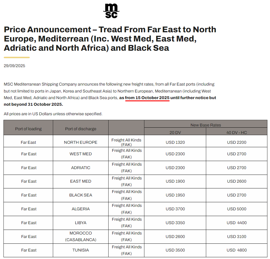 MSC宣布,远东港口至北欧、地中海和黑海港口等实施新运价,自2025年10月15日起直至另行通知,但不超过2025年10月31日。