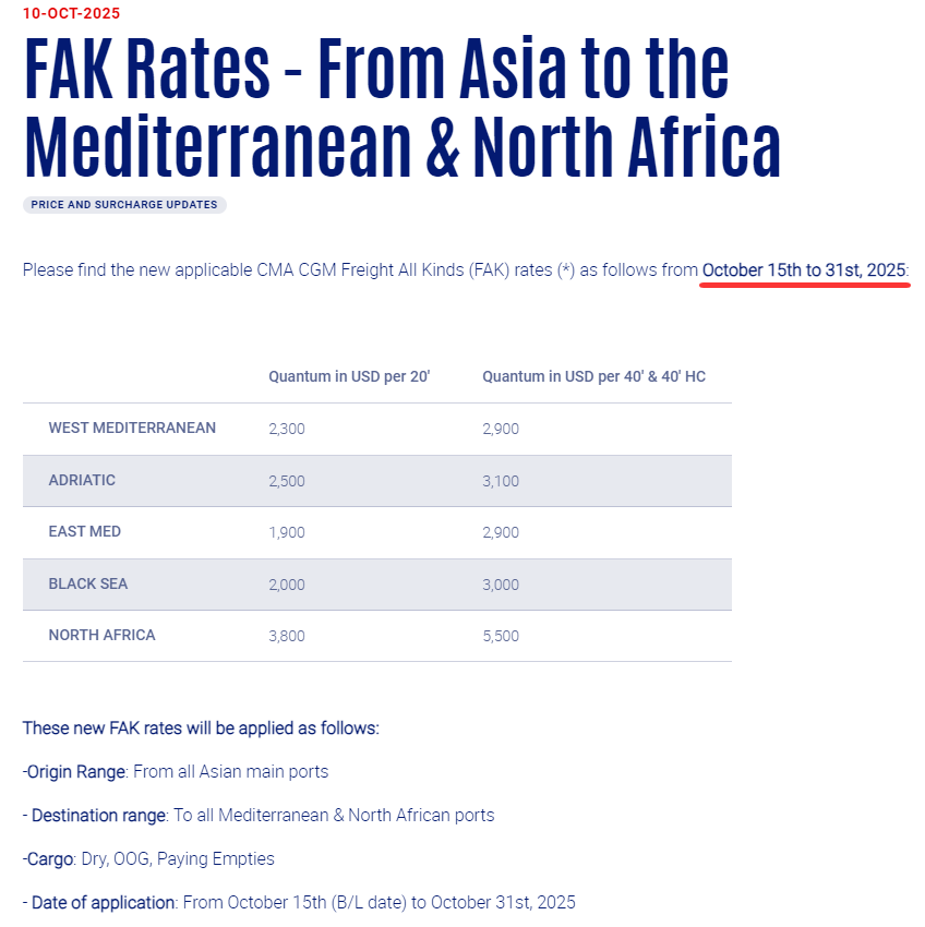 达飞宣布,2025年10月15日至31日,调整从亚洲到地中海北非FAK费率。