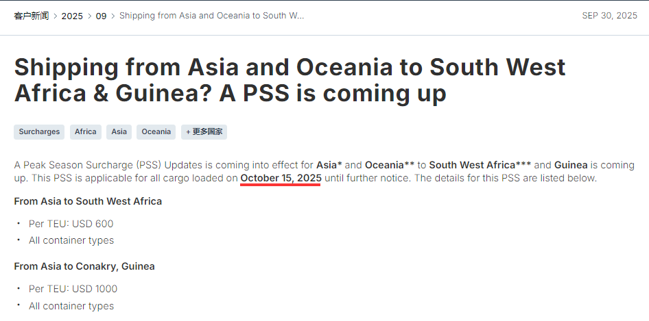 赫伯罗特宣布,从亚洲和大洋洲到西南非洲和几内亚,调整征收旺季附加费PSS,2025年10月15日装载的所有货物,直至另行通知。