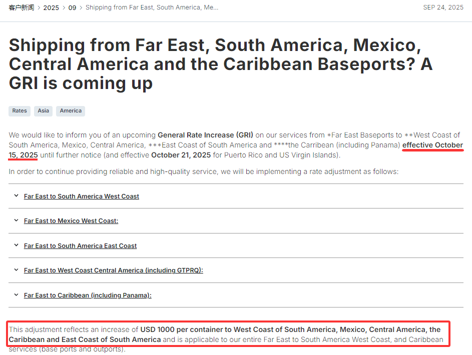 赫伯罗特还宣布,将调整征收远东至南美、墨西哥、中美洲和加勒比海的GRI费率。2025年10月15日生效,直至另行通知。