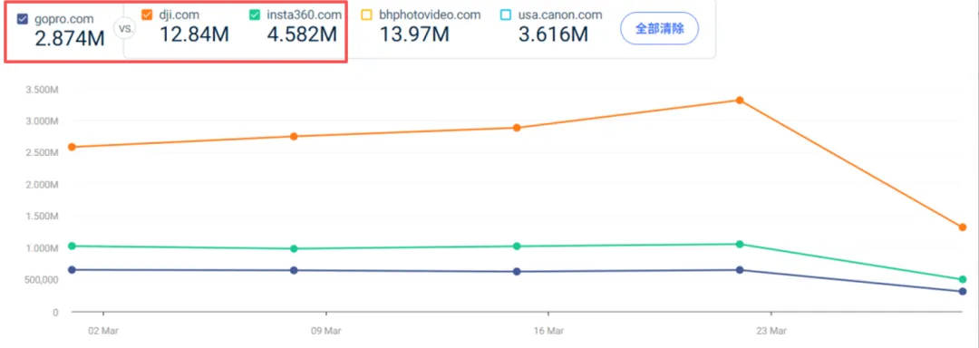 而同比的大疆独立站访问量为1284万,影石是458万。