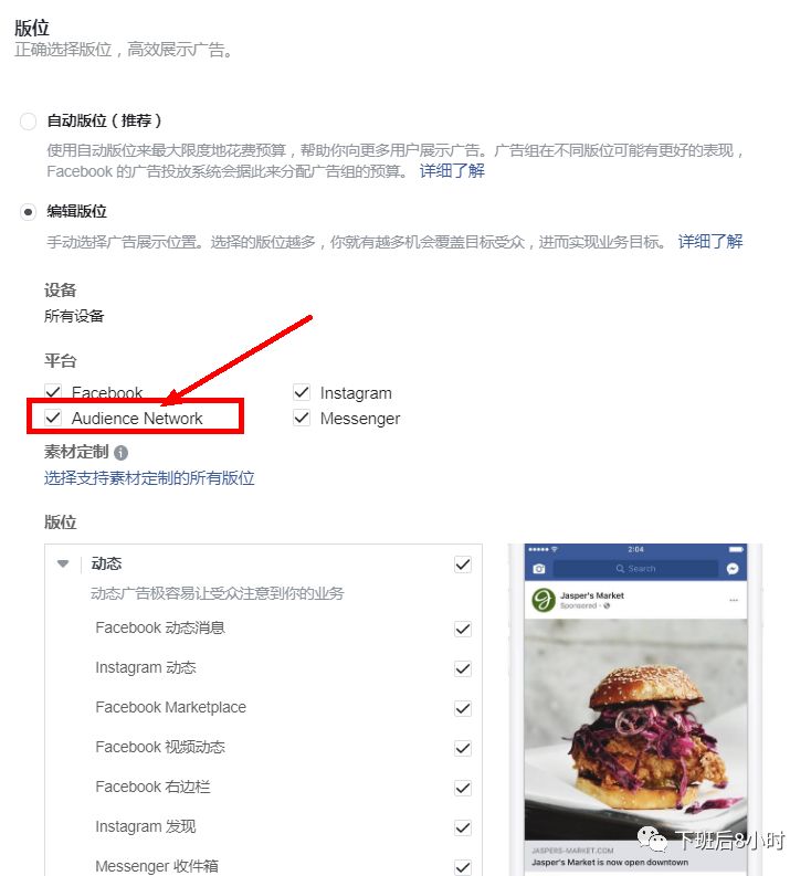 如果只是为了查看audience network的广告成效,可以只勾选这个版位,也可以选择自动版位在后台广告成效那里进行投放版位的分析。