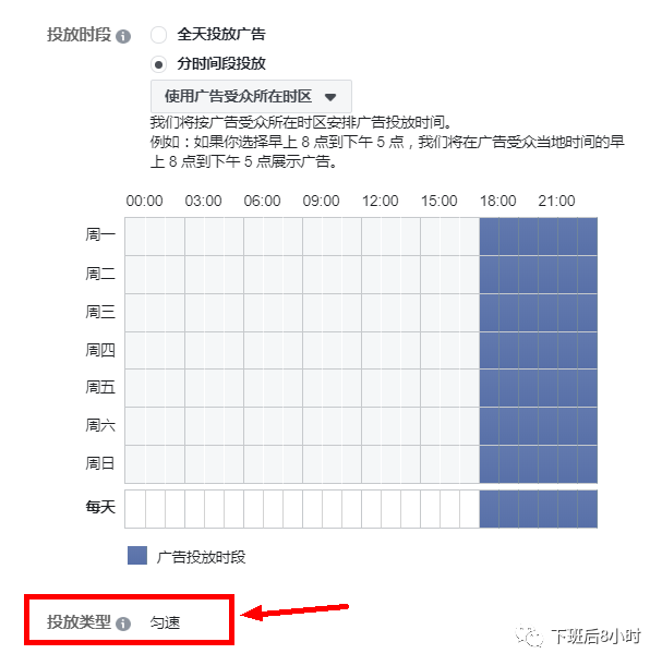 排期可以设置always on,也可以设置每天固定的时间跑,比如设置为每天的晚上6点到10点左右跑, 这个时间段互动率可能高些,分时段投放只适用于预算设置为总预算,单日预算的不能设置分时段投放。