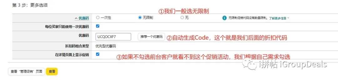 ② 我们选择“无限制”这里就会自动生成一个code,我们也可以自己编写,对于后续促销订单跟进也有区分作用。
