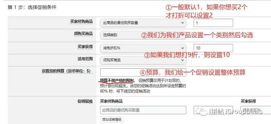 ① 这里设置买家需要购买多少个产品才可以参加我们这个促销活动,一般我们设置1个,即买家购买1个产品就可以享受折扣。