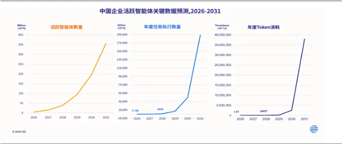 IDC数据显示,中国企业活跃智能体数量预计将在2031年突破3.5亿规模,年复合增长率达到135%以上。同时,由于智能体任务执行密度和任务复杂度的提升,也将带来智能体Token消耗年均超30倍的指数级增长。