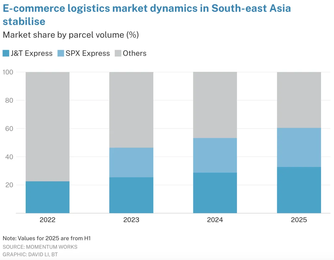根据 Momentum Works 汇编的数据,在 2022 年至 2025 年期间,J&T 在东南亚的包裹量激增约三倍,同时其每包裹单位成本也下降了约三分之一。该公司在 2024 年实现了首次全年净盈利。