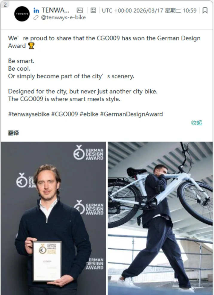 在渠道层面,Tenways 强化了 B2B 维度的传播建设,通过 LinkedIn 持续输出产品获奖、行业活动与合作进展,强化其在行业中的专业形象与合作可信度。不同于多数消费品牌对该平台的弱化使用,其将 LinkedIn 作为连接经销商与合作伙伴的重要沟通节点,使品牌影响力能够有效传导至渠道侧,从而支撑经销网络的扩展与稳定。