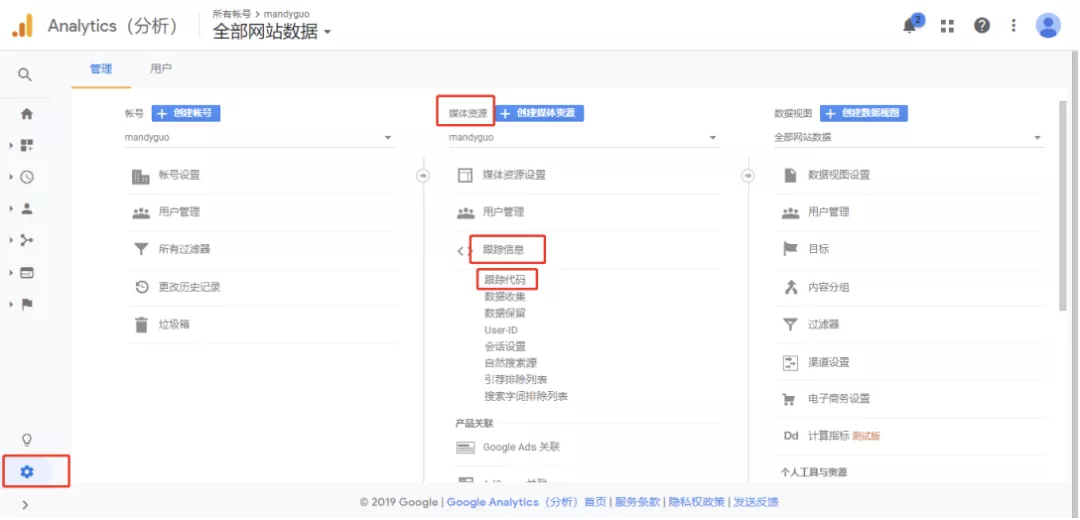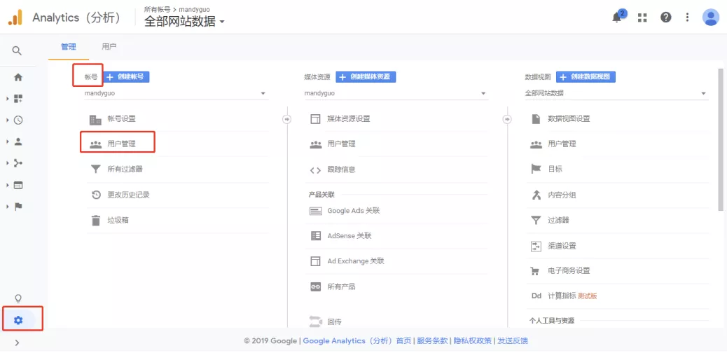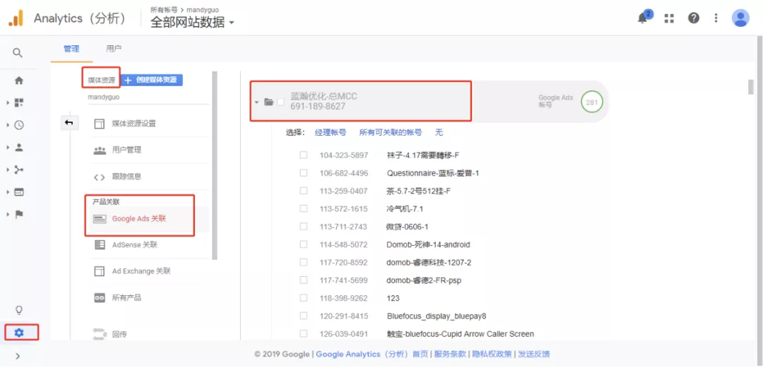 进入GA,在管理界面的媒体资源部分选择需关联账户进行添加,操作如图所示