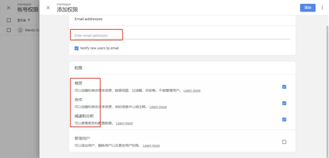 点击进用户管理后,在右上角点击加号添加用户,输入需授权的邮箱,点击前三个权限如下图。