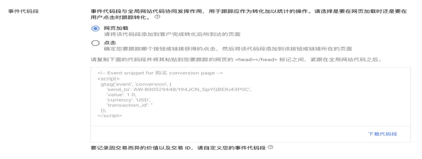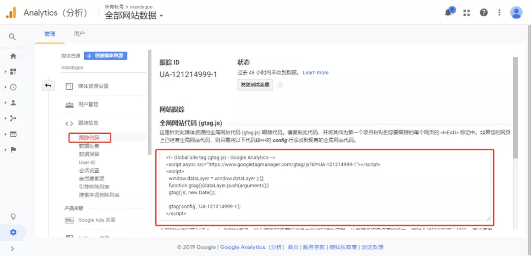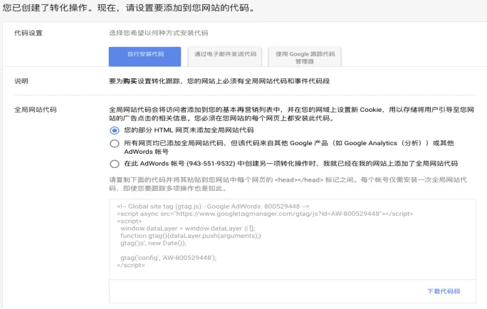 点击进跟踪代码后,下图中的全局代码即为客户需要在推广网站上添加的跟踪代码。
