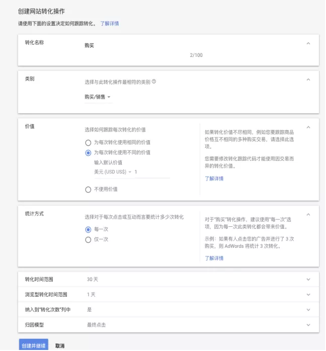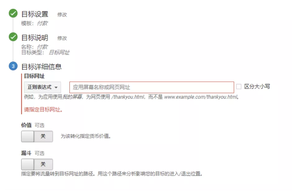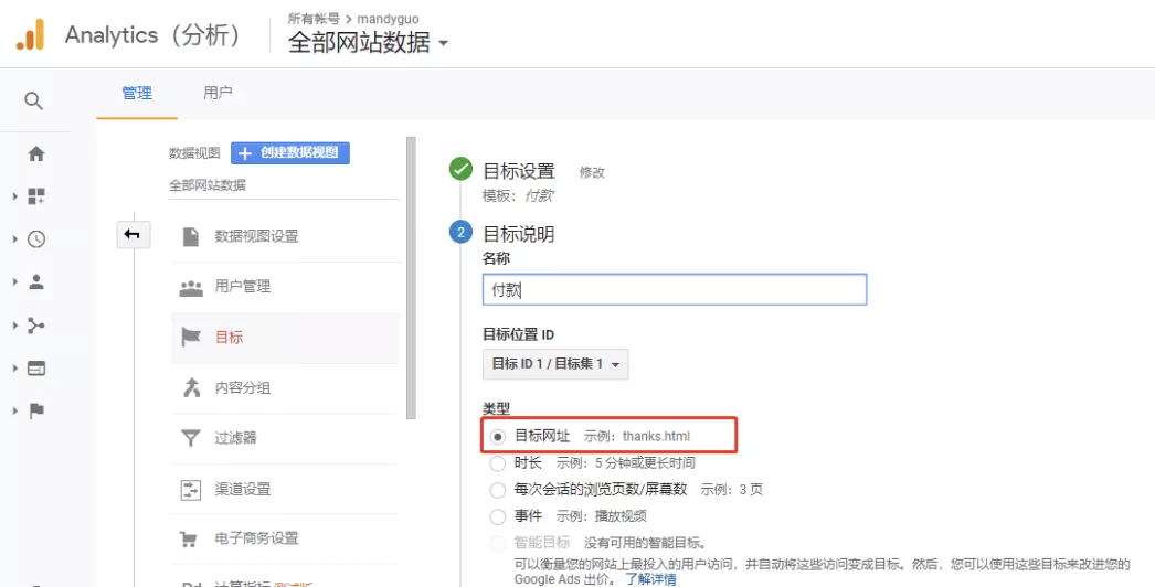 选择要添加的营销目标,以付款为例,类型选择目标网址