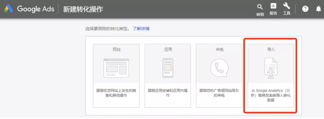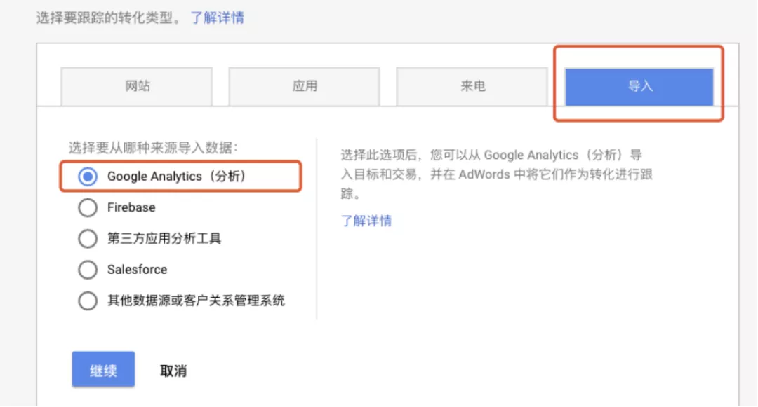 按照如图操作步骤,点击继续后选择GA已经创建好的目标即可。