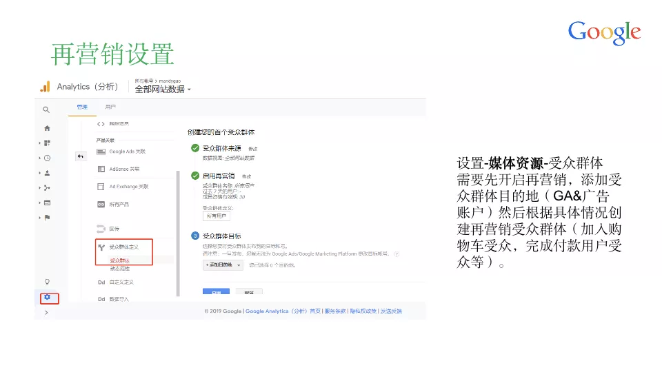 需要先开启再营销,添加受众群体目的地(GA&广告账户)然后根据具体情况创建再营销受众群体(加入购物车受众,完成付款用户受众等)。