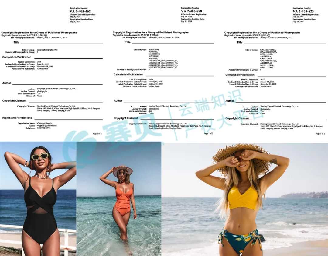 这次案件涉及3组CUPSHE的泳装产品宣传图,共21张,版权编号分别是VA2-405-462、VA2-405-623、VA2-405-898。赛贝提醒跨境卖家,未经授权不得擅自使用,以免引发侵权风险。
