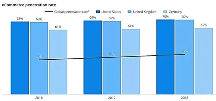 目前德国整体的电商渗透率较高,仅次于英美两国,达到62%,远高于全球平均水平37%。
