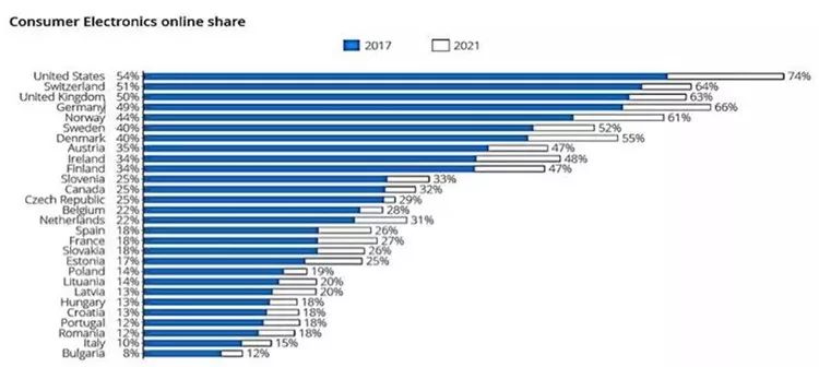 2017年德国约49%的消费电子产品通过网络渠道销售。而到了2021年,这一比例将跃升至66%。届时德国将超过英国,成为仅次于美国的消费电子产品在线交易比例第二高的市场。