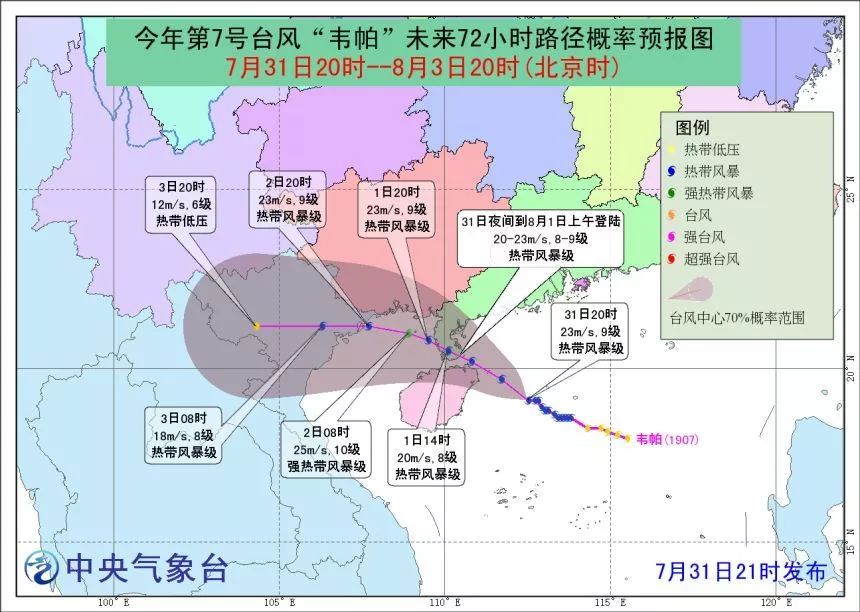 受台风影响,7月31日20时至8月1日20时,南海大部、广东沿海、海南岛沿海、广西沿海、琼州海峡、北部湾将出现6~7级大风;其中,南海北部和中部的部分海域、广东西部沿海、海南岛东部和北部沿海、琼州海峡将有8~9级大风,北部湾北部的部分海域风力可达9~10级,阵风11~12级。中央气象台7月31日18时继续发布台风蓝色预警。