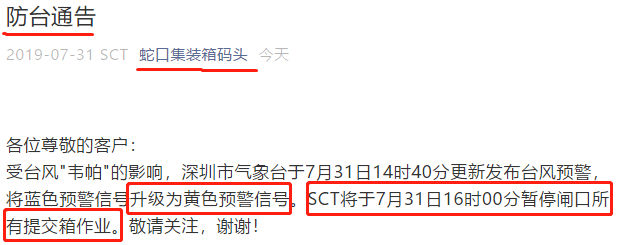 各大港口的台风警报,已无法提空箱等。这里请大家务必注意,提前做好准备。以免此次台风“韦帕”可能带来的强风暴雨,道路拥堵、码头关停等影响带来损失。