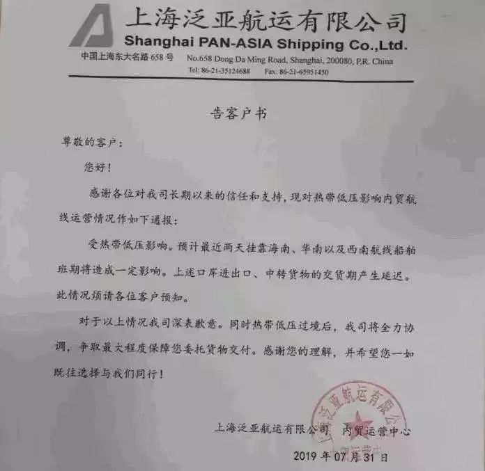 其中提到,受热带低压影响,预计最近两天挂靠海南、华南以及西南航线船舶班期将受到一定影响,上述口岸进出口、中转货物的交货期,将产生延迟。热带低压过境后,该公司将全力协调,争取最大程度保障货物交付。