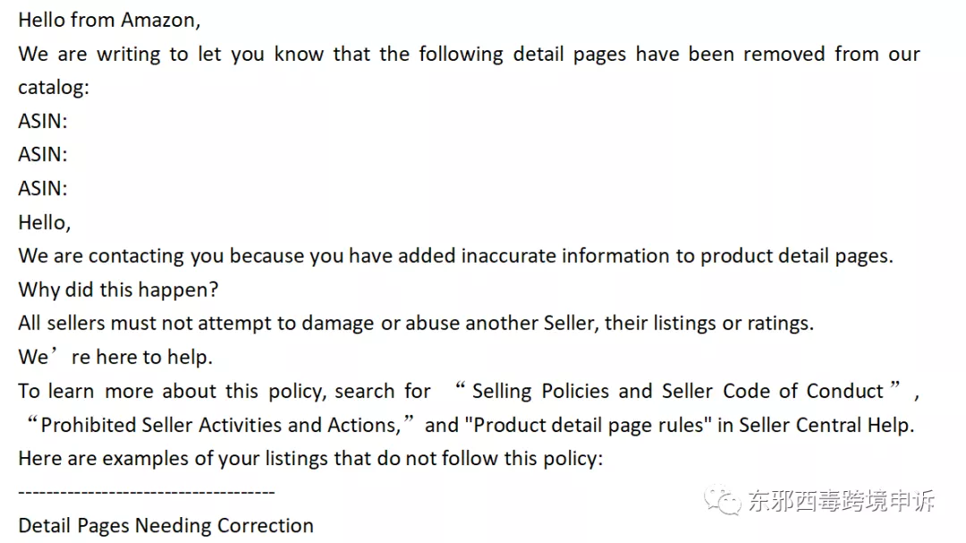这几天事情有点多,没有更新文章,但是该更新的总是会更新的。之前提到的一批因操纵评论导致卖家账号被封的大量咨询,今天聊一聊由于在产品详情页添加不正确信息导致链接被下架的情况,其实早在6月9号左右就有卖家和我反馈,一直到这几天似乎有燎原之势,一大波卖家朋友收到了这类邮件。好,废话少说,下面就是最近让很多卖家朋友咬牙切齿的邮件中的一部分。