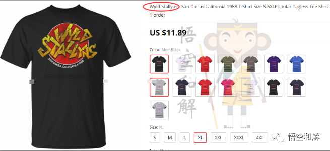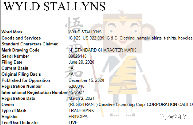 原告公司注册了WYLD STALLYNS这个商标,注册大类为025服装鞋帽,这类产品的卖家千万警惕不要直接使用WYLD STALLYNS,产品标题、描述尤其是图片上面,都不可出现: