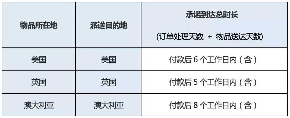 1、规范海外仓服务的承诺时效: 卖家在刊登物品时,设置订单处理天数(Handling Days)及所提供物流选项的承诺到达天数 (Estimated Delivery Days),两者相加总时长不超过以下规定, 否则将视为不合规刊登。以下为最新要求: 2、考核海外仓订单的实际履行情况: 英国海外仓5个工作日内及时送达率的要求从原先50%提升至80%,美国海外仓的揽收扫描的要求从原来2天缩短到1天,并且美国和澳大利亚海外仓的及时送达率将纳入考核指标。最新的要求如下: 及时发货率 : - 美国海外仓:不低于80%的揽收扫描在买家付款后1个工作日内 (另,eBay开始跟踪各海外仓的及时发货率并且审查“揽收扫描”的有效性。“揽收扫描”必须为当地邮局扫描包裹并确认揽收的时间。建议卖家使用可提供有效“揽收扫描”的物流服务商。) 及时送达率: - 美国海外仓:不低于80%的送达扫描在买家付款后6个工作日内 - 英国海外仓:不低于80%的送达扫描在买家付款后5个工作日内 - 澳大利亚海外仓:不低于80%的送达扫描在买家付款后6或8个工作日内 (发往悉尼,墨尔本,布里斯班,堪培拉和阿德莱德五大都市圈的货品需于6 个工作日内送达,其余地区于 8个工作日内送达) (在此提醒卖家务必选用提供“送达扫描”的物流服务以满足政策要求。) 物流不良交易率的要求保持不变 - 美英德澳海外仓:不高于2.0%; - 其他海外仓: 不高于2.5% 2019年4月21日开始的交易将按照最新的标准进行考核。首次评估日为2019年6月4日,被评估的交易窗口为2019年4月21日至2019年5月18日。为了避免账户未达标而受到销售限制,或不合规刊登被下架, 请卖家及时登陆卖家中心了解海外仓各项考核指标的表现情况,找出未达标原因并加以改善。德国海外仓服务标准将随后通知。 以上来源:eBay