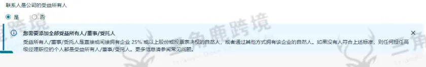 页面最后关于“是否为受益所有人”的确认,则进一步锁定了责任主体。一旦选择“是”,意味着该法人被认定为公司实际控制人或核心利益相关方,需要对前面提交的所有身份、地址及纳税信息承担完整且一致的责任。