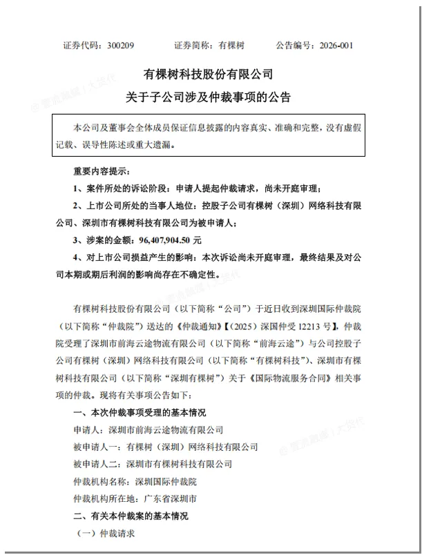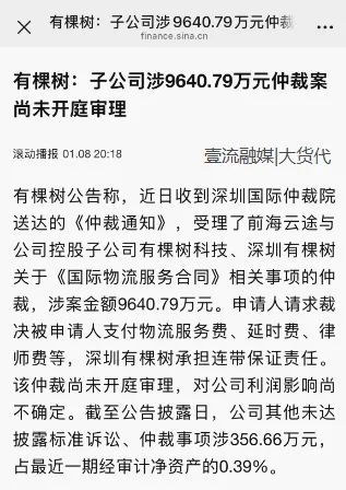 跨境电商知名上市企业有棵树发布相关公告,称,近日收到深圳国际仲裁院送达的《仲裁通知》,受理了前海云途与公司控股子公司有棵树科技、深圳有棵树关于《国际物流服务合同》相关事项的仲裁,涉案金额9640.79万元。