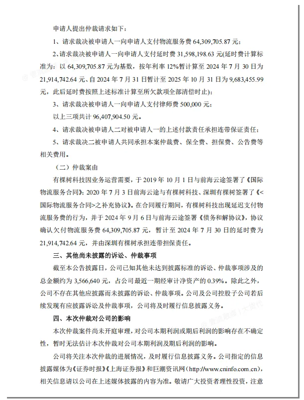 简而言之,深圳有棵树的旗下控股公司有棵树科技,欠了前海云途6400多万的物流费,这几年一直没付,因此云途走法律途径,提出仲裁请求支付并再支付2100多万的延时费、律师费等等仲裁请求。