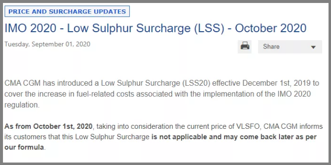 该航运公司表示:“从2020年10月1日起,考虑到当前极低硫燃料油(VLSFO)的价格,此附加费将不再适用。”