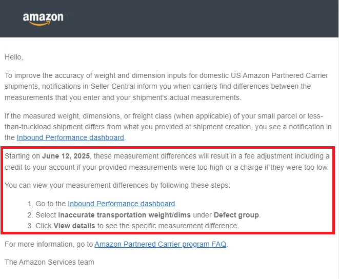 新政策针对通过亚马逊合作承运商发货的卖家,若包裹实际重量、尺寸或货运等级与创建货件时申报的数据不符,系统将自动执行运费补差或退款: