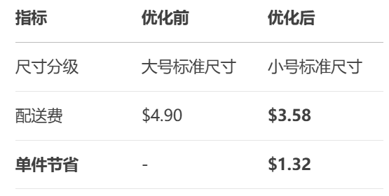 将外盒长度从18英寸压缩至17.9英寸(亚马逊尺寸舍入规则:17.9→17英寸) 替换纸质内衬为蜂窝纸板,重量从1.1磅降至0.98磅 优化后尺寸:17.9"x14"x4" → 归类为小号标准尺寸