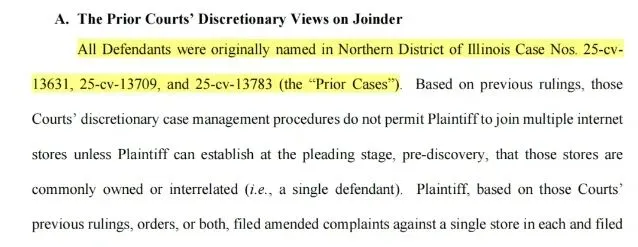 Blakey法官随即下达指令,要求原告说明本案被告是否曾在过往案件中被提起过相同侵权主张。原告在补充报告中不得不承认,本案被告均源自此前该法院的三起案件,且在这三起案件中,原告均采用“立案后缩减被告、另行立案”的操作——每当案件分配至对“被告合并”持严苛态度的法官名下,便通过修改诉状拆分被告,直至案件分配到其认为更“友好”的法官手中。
