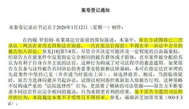 无独有偶,近期美国伊利诺伊州北区联邦法院的一起案件,也迎来了振奋人心的反转——原告代理律所因刻意“挑选法官”规避不利裁决,被法官当庭认定滥用司法程序,最终案件被终局驳回且禁止再诉。