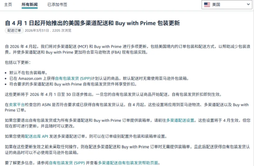 亚马逊宣布,从2026年4月1日起,多渠道配送(MCF)和Buy with Prime将推行一系列包装与配送方面的调整,4月内会逐步完成切换。